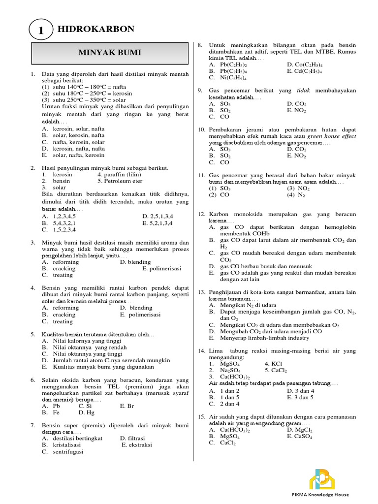 Latihan soal kimia hidrokarbon dan minyak bumi beserta jawabannya untuk kelas xi untuk kurikulum yang lama sebenarnya menjadi bab terakhir di semester 2 kelas x. Bank soal kimia kelas x hidrokarbon dan minyak bumi by unknown 24 feb 2015 1 comment berikut merupakan contoh soal hidrokarbon dan minyak bumi yang saya susun secara berseri. Soal dan pembahasan ph hidrokarbon dan minyak bumi kelas 11 pdf berikut ini adalah kumpulan soal kimia kelas xi semester 1 yang dapat digunakan sebagai bahan belajar file pdf menghadapi penilaian harian ph ulangan harian.