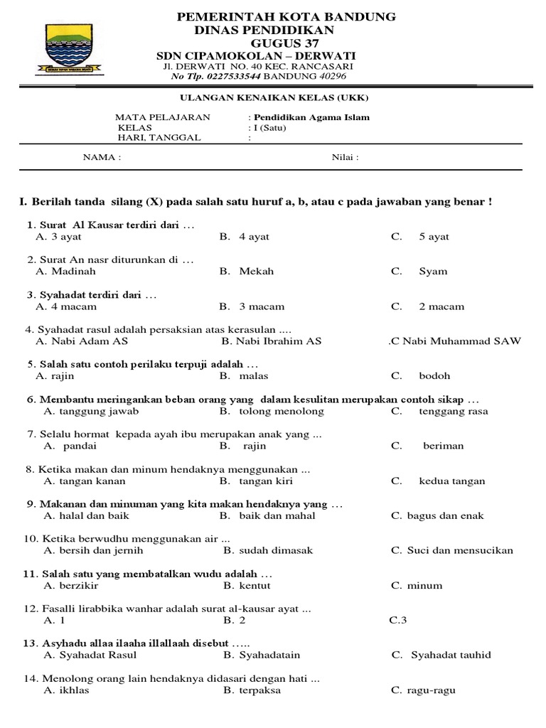 Soal Ukk Agama Islam Kelas 1 5 Sd