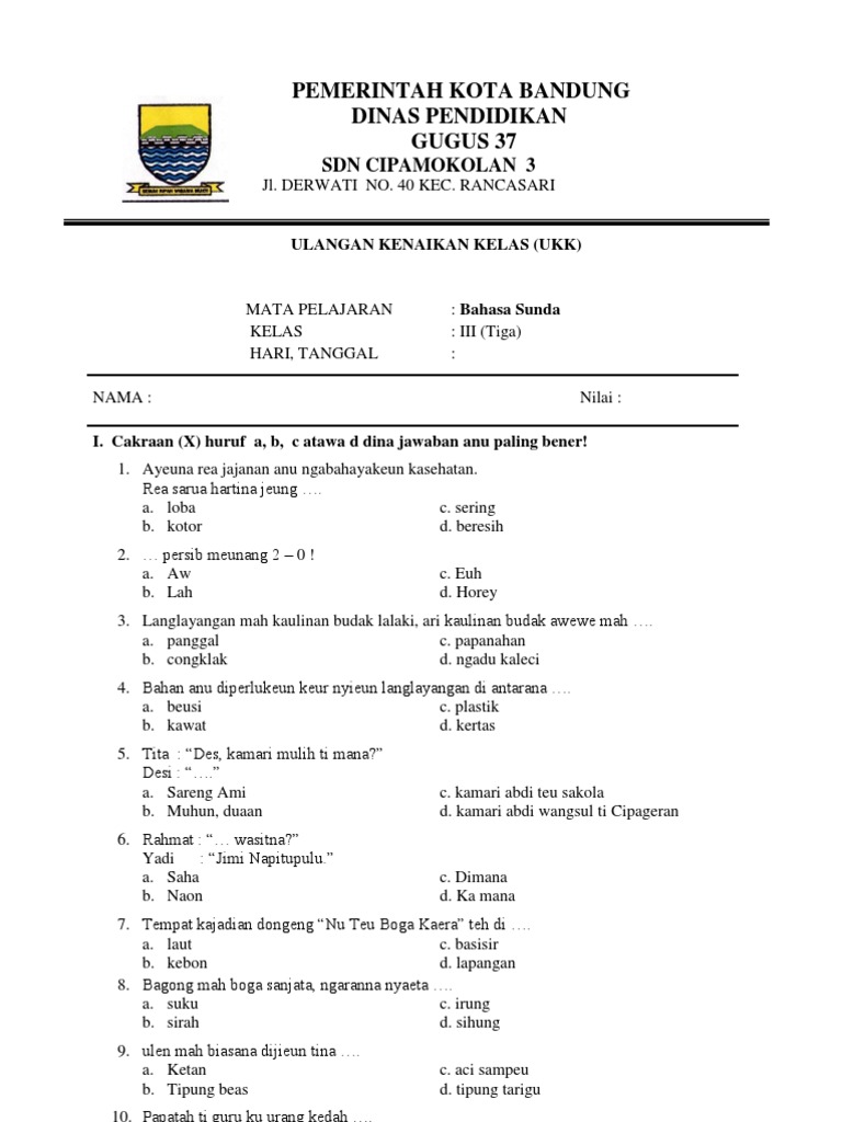 Soal uts bahasa sunda kelas 3 sd semester 1 dan artinya. Jawaban Soal Ukk Bahasa Sunda Kelas 3 2021. Mari bagi bapak ibu guru yang membutuhkan soal pts uts kelas 3 sd mi semester 1 kurikulum 2013 bisa mengunduhnya melalui tautan link di bawah ini.